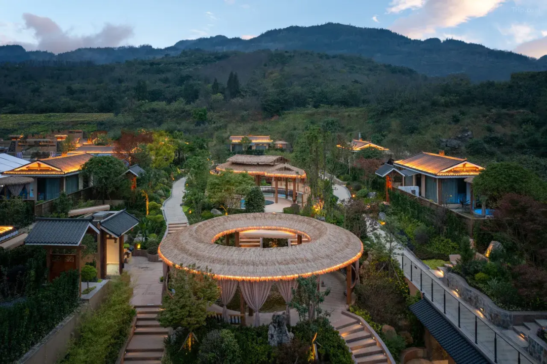 “隐于森野、沐于汤泉、半溪明月、筑梦云端”,沐云温泉主打一个诗意。温泉所在地森林覆盖率高达65%,植被覆盖率更是超过95%,是货真价实的天然氧吧。