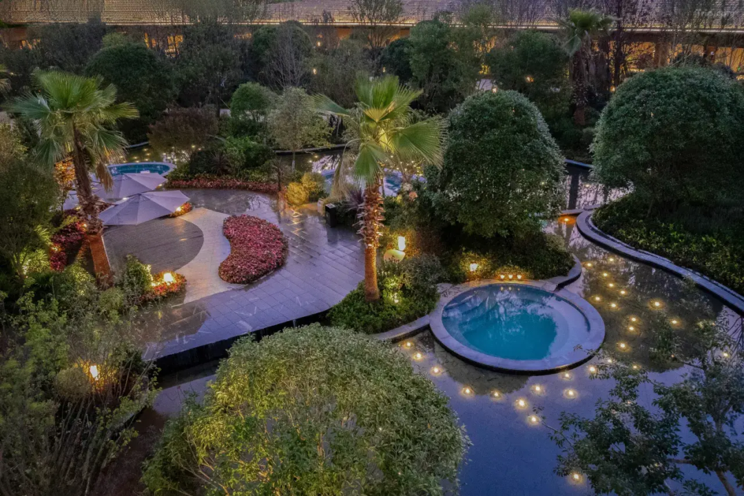 沐云的整体建筑融合了现代美学,风格比肩奢华酒店,对有出片需求的女生非常友好。园区内,26个室外泡池分布在花草之间,来自地下2809米的温泉水,轻轻洗去人们的倦意。